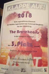 Junge auf der Lan-Party nicht mehr konzentrieren kann und nach Hause geht, während das Mädchen bei ihm zuhause einbricht, um den Laptop zu klauen, kommen sich die beiden näher und sprechen miteinander. Und wer weiß, was dann passiert?! 😉 Bei der Prämierung am Freitag wurden zu erst alle Filme in den Kategorien Amateur und Semiprofessionell angesehen, danach gab es die Siegerehrung. Wir freuen uns sehr über den dritten Platz und unseren Gewinn von 100 Euro.