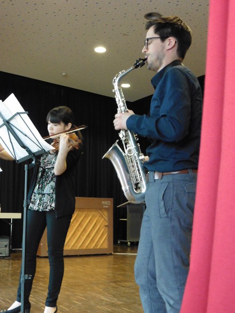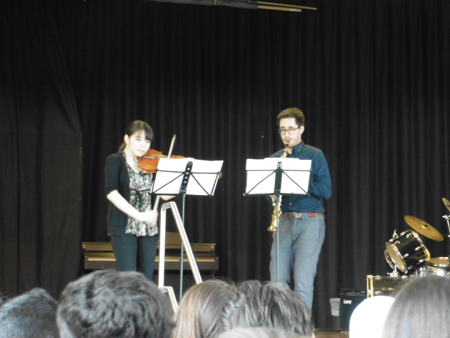 Auch in diesem Jahr hatten wir wieder Musikstudenten von der Musikhochschule in Köln zu Gast, die uns die klassische Musik näher brachten. Diesmal besuchte uns das Duo Affekti, das mit der spannenden Instrumentenkombination von Geige und Saxophon viele klassische Stücke von Mozart, wie „Le nozze di Figaro“, „Don Giovanni“ oder Teile aus der „Zauberflöte“, einen Tango und viele andere Stücke auf unserer Bühne darbot. Unsere Schüler, die vielfach nicht so nah dran sind an Klassik, genossen den Auftritt sehr. Sie