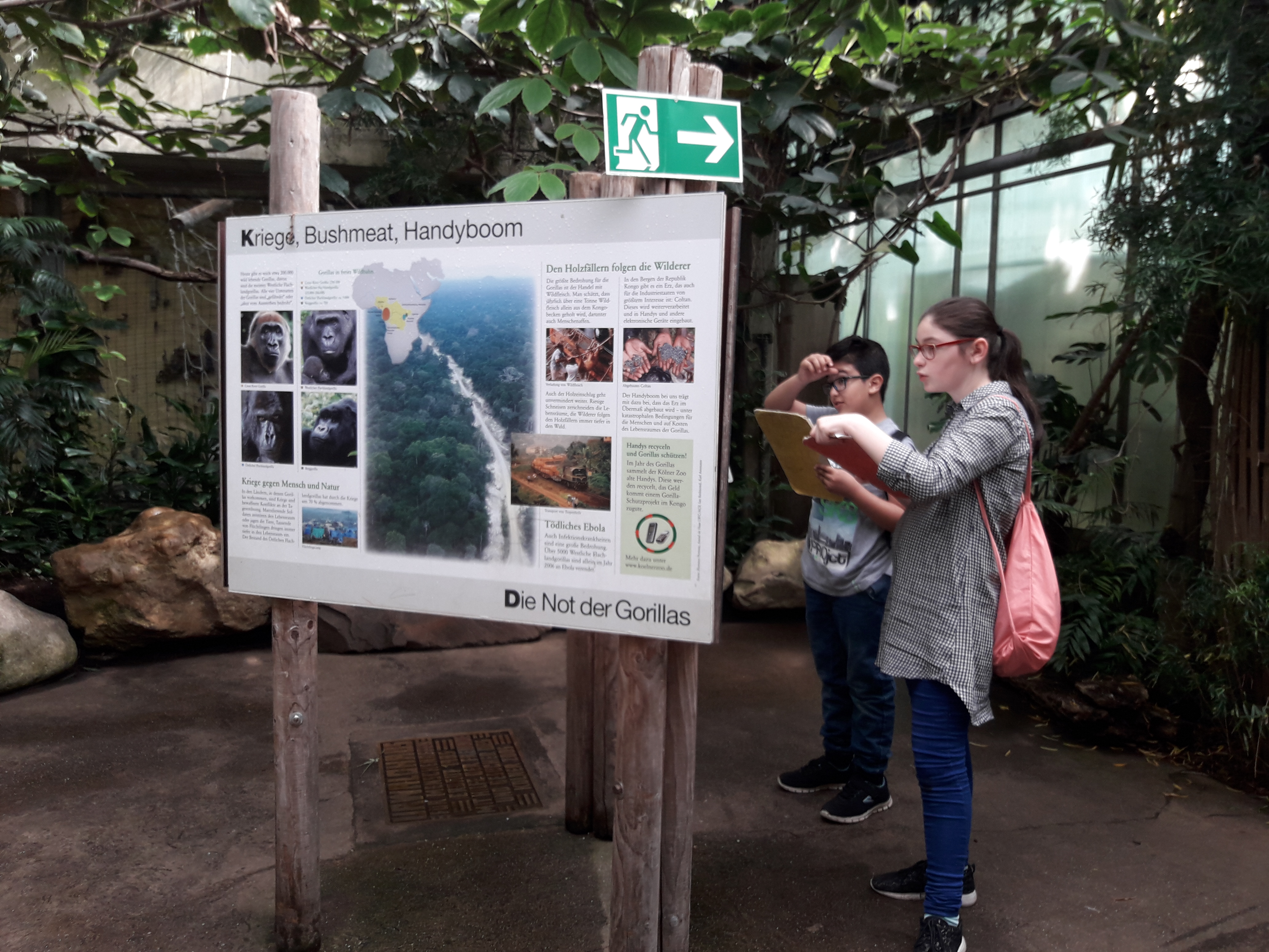 Lemuren im Haus aber keine wilde Party am Feiern waren, sondern die meisten auch faul rumhingen, manche sogar in der Hängematte, blieb die Beobachtungsaufgabe genauso entspannt für uns. Zum nächsten Treffen hatten wir etwas Zeit den Zoo zu erkunden. Die größte Begeisterung lösten die Pinguine aus, die sehr laut und wirklich seltsam nach Futter zu rufen schienen. Richtig toll war aber, dass man die schwimmenden Pinguine im Wasser beobachten konnte und dass sie auf einen zu schwammen und sich super fotografieren ließen. Sie kamen ganz dicht ran. Man hätte sie berühren können, wäre da nicht diese Glasscheibe dazwischen gewesen. Zurück in der Zooschule haben wir unsere Ergebnisse besprochen. Und so mancher entpuppte sich als richtig kleiner Forscher. Auch wenn uns das etwas an Schule erinnert hat, so hat es trotzdem richtig Spaß gemacht! Dazu schien die Sonne und es wurde ein herrlich warmer Tag. Am Ende durften noch alle Gruppenweise durch den Zoo gehen. Wir haben alle den Wecker am Handy gestellt, damit wir uns pünktlich wieder zur Rückfahrt treffen. Doch bis dahin bleib doch einiges an Zeit viele Tiere zu bestaunen, die man ja nicht jeden Tag zu sehen bekommt. Toll fanden wir die Paviane, die entweder heftig miteinander gekämpft haben oder sich gegenseitig entlaust haben. Nicht so lecker zu beobachten war, dass sie dann die Läuse gegessen haben. Faszinierend war der Dschungel, in dem die bunten Vögel frei rumfliegen können. Darin war ein großer Teich mit rießigen Fischen, die richtig dicke Lippen hatten. Ebenfalls toll waren die Schlangen, davon vor allem die Python. Aber all die anderen Affen und Elefanten zu sehen hat Freude gemacht. Oder einfach nur auf dem großem Spielplatz zu tollen. Doch neben all den exotischen Tieren, die man zu sehen bekommt haben unsere heimischen Tiere den meisten ebenfalls richtig Spaß gemacht. Die ganzen Meerschweinchen, die Esel, süßen Schweine, und ganz niedlich die winzigen Ziegen, die man streicheln durfte!!