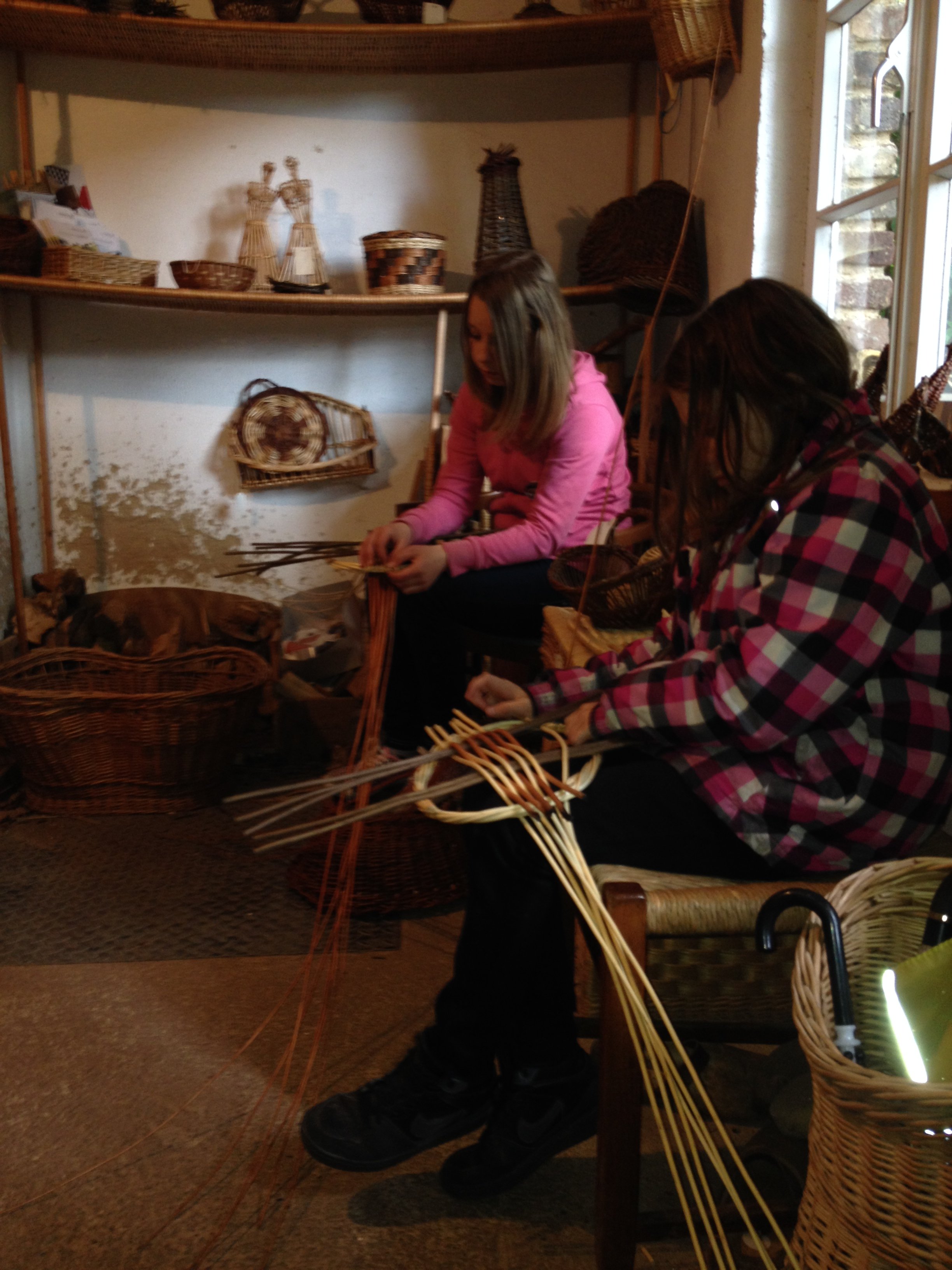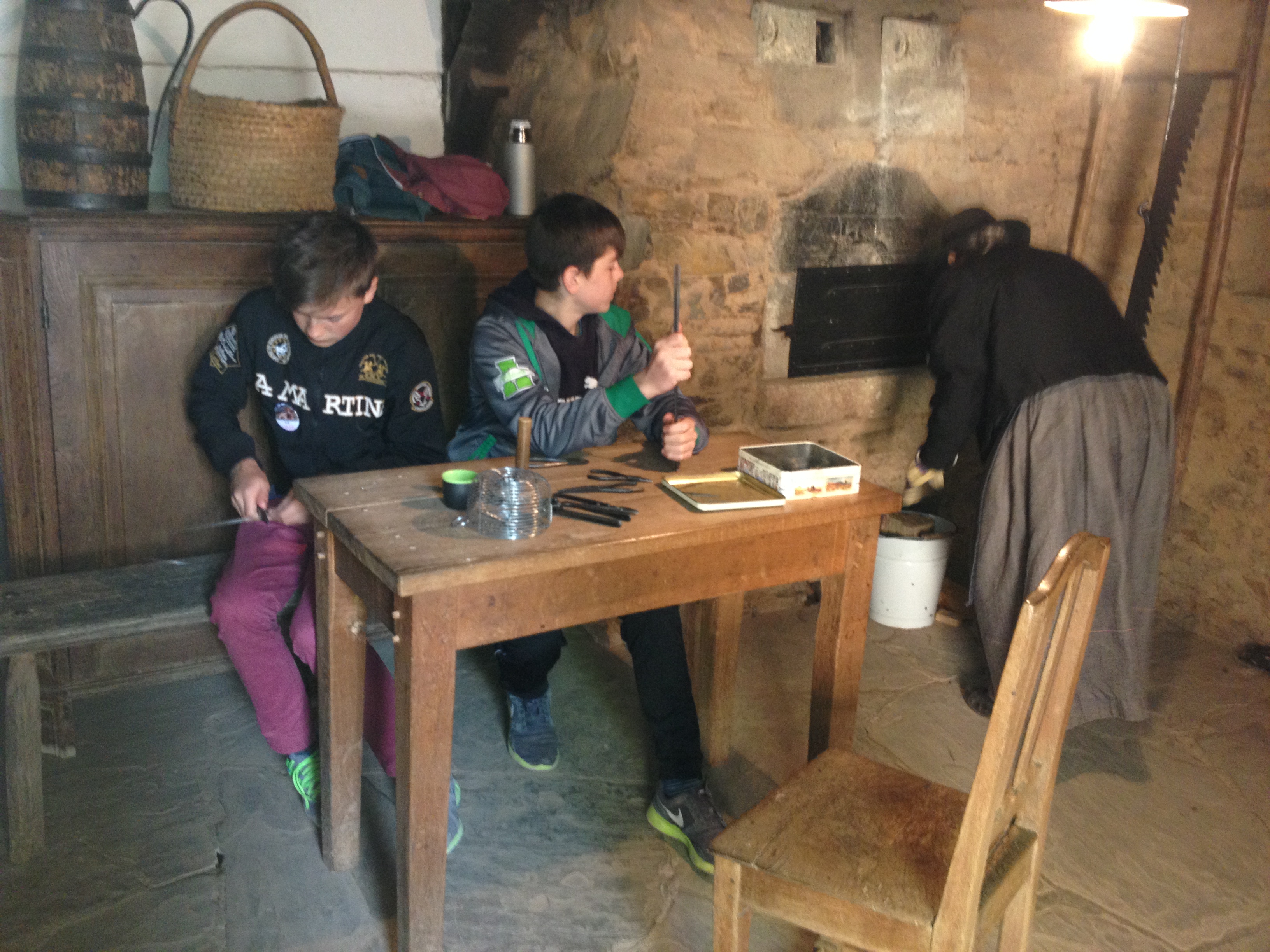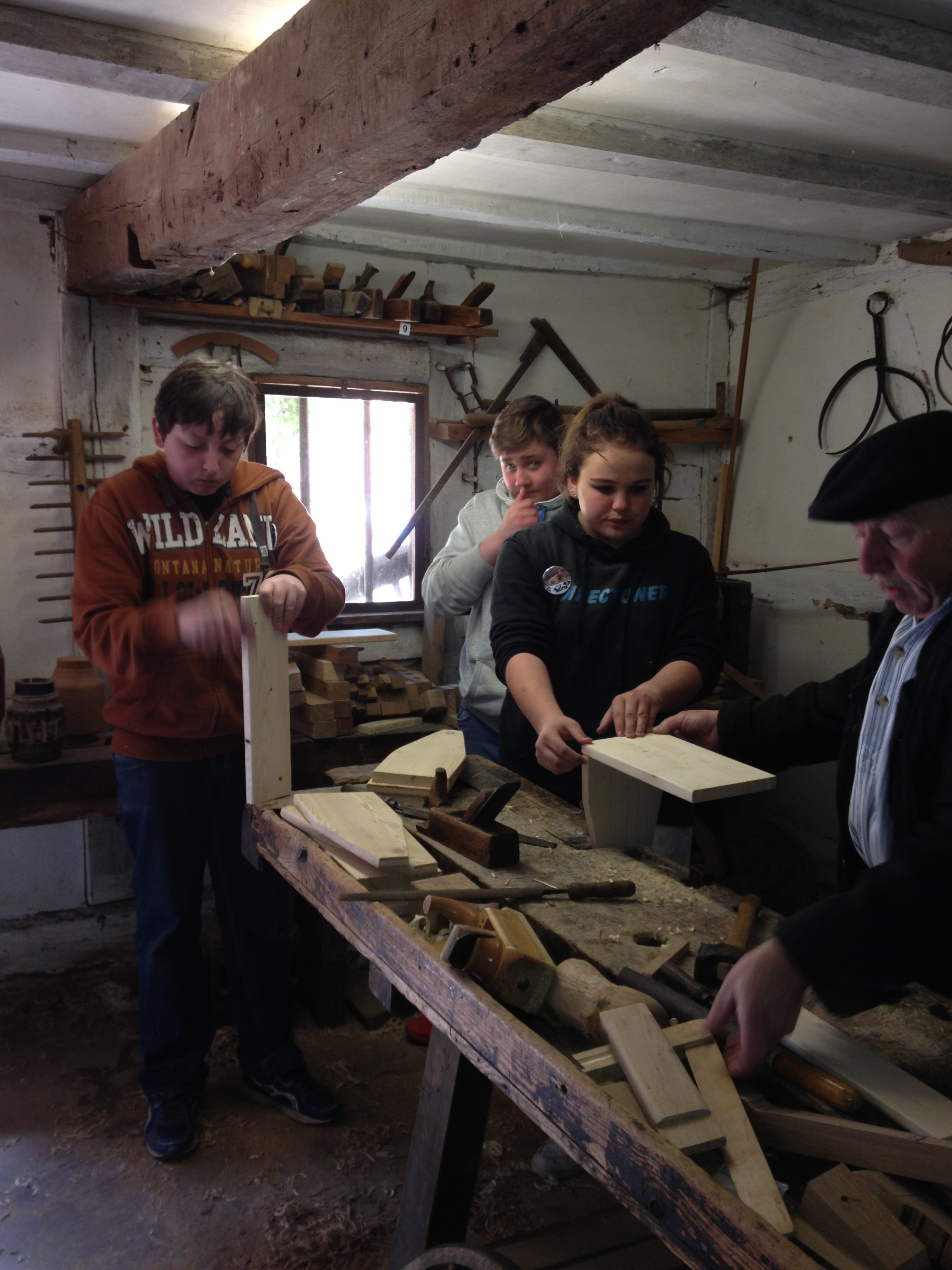 So arbeiteten sie in kleinen Gruppen beim Bäcker, beim Schmied, in der Landwirtschaft und bei den Hauswirtschafterinnen. Außerdem bauten sie Lebendfallen bei der Musfallkrämerin, flochten Körbchen bei der Korbmacherin und schreinerten Werkzeugkisten beim Stellmacher.