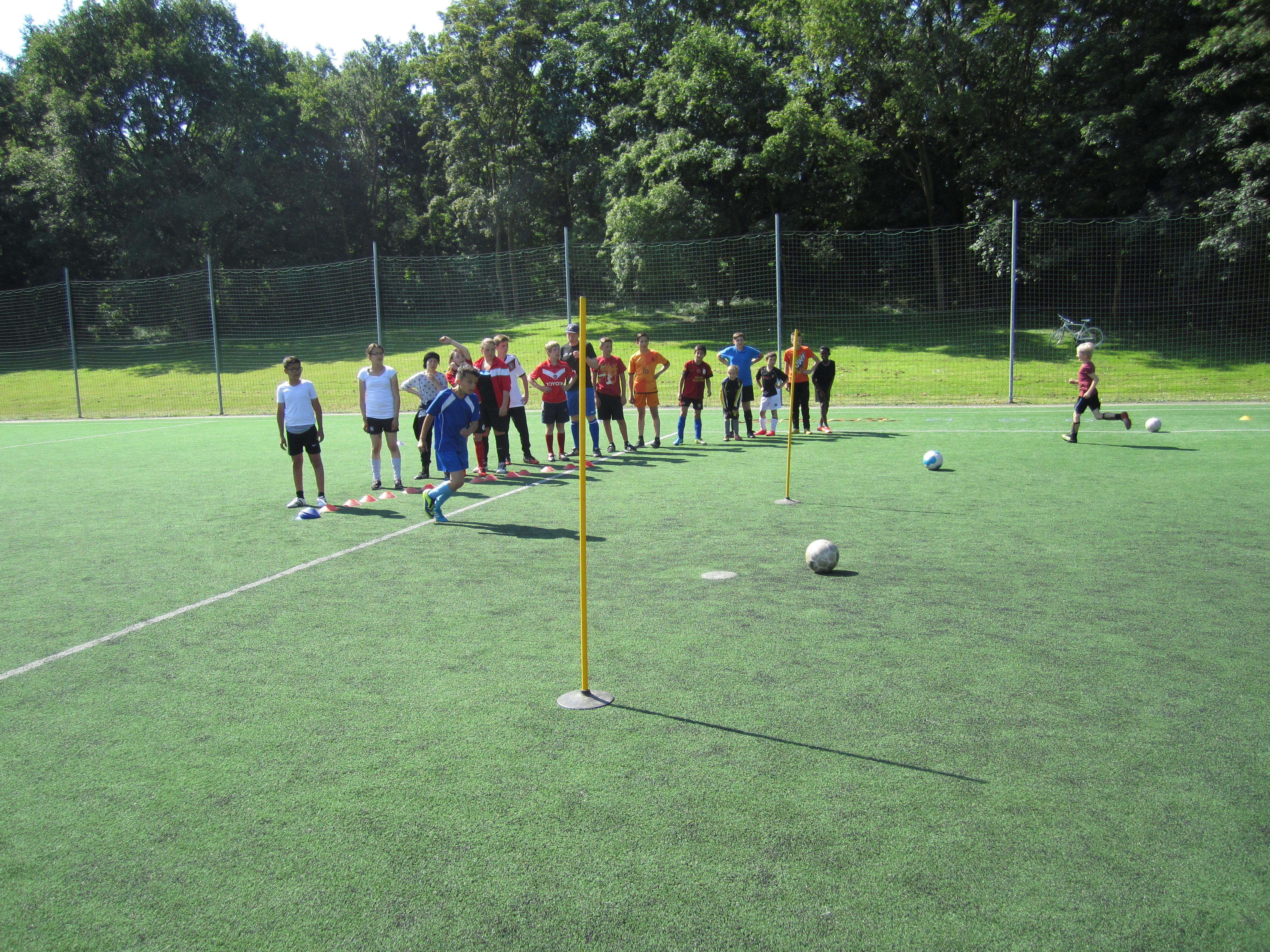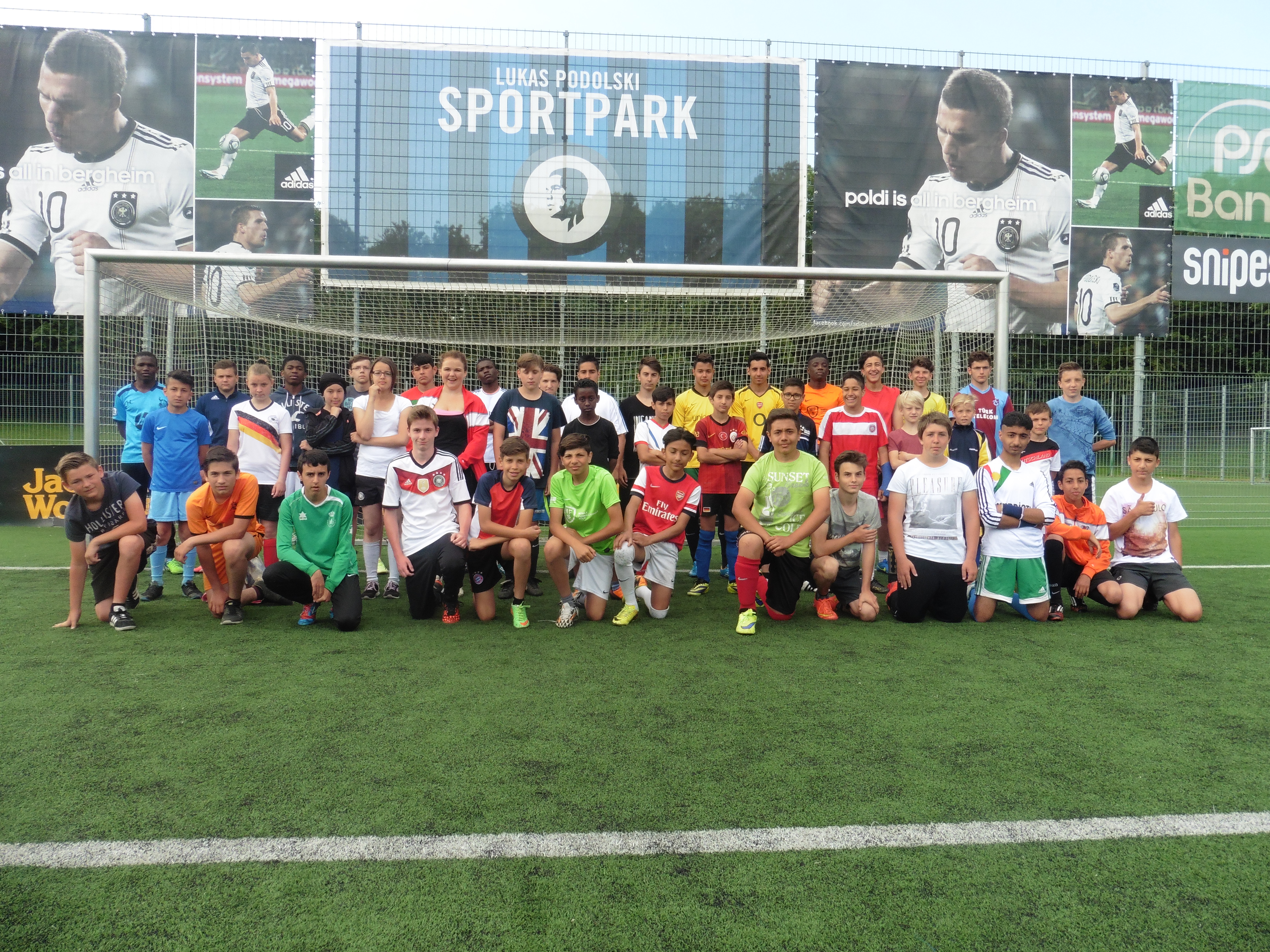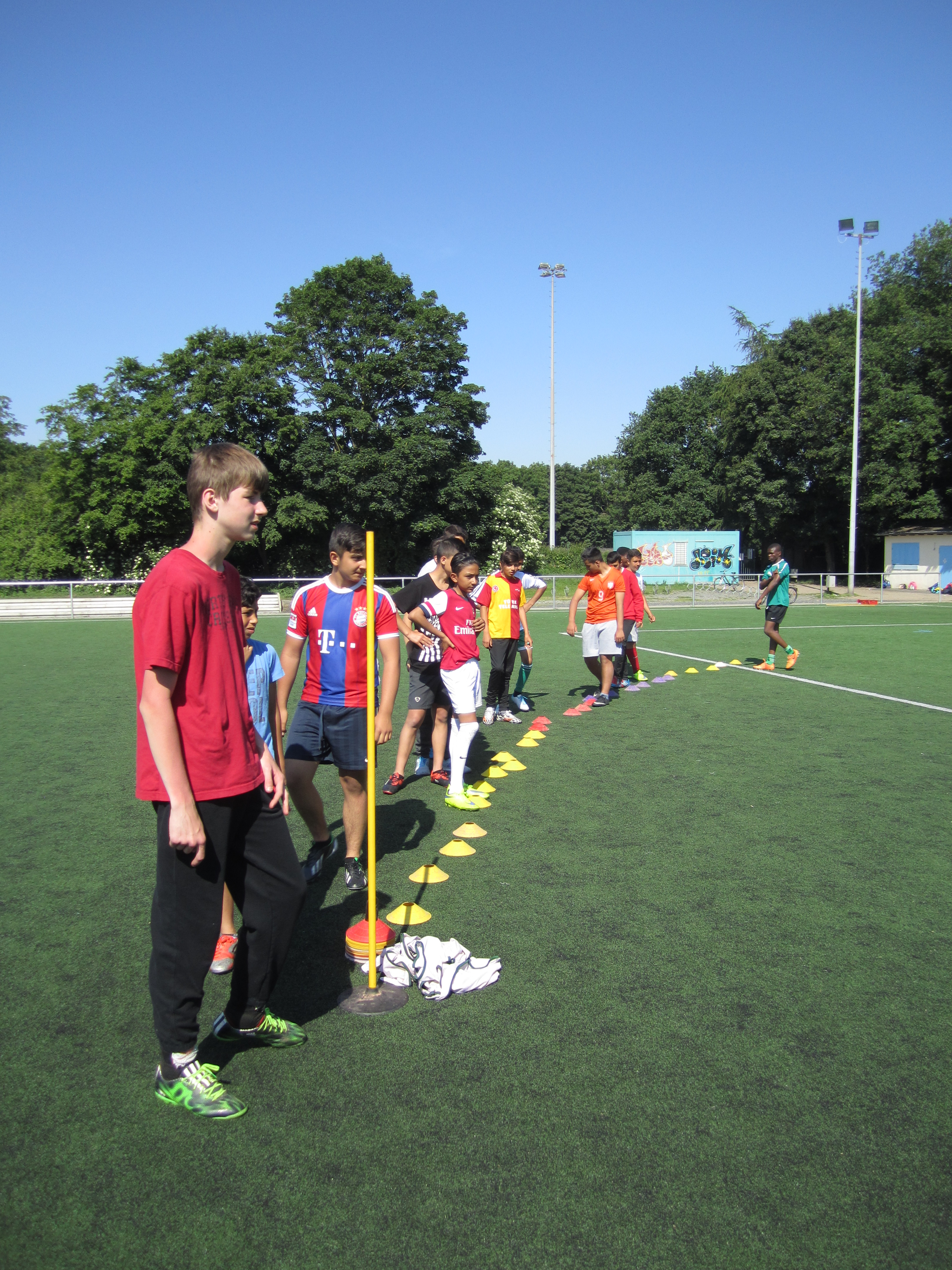 In der Woche vom 08.06. – 12.06. hieß es wieder „Das Runde muss in das Eckige“. Zum bereits 3. Mal veranstalteten wir wieder ein einwöchiges Fußballcamp für unsere fußballbegeisterten Schüler und Schülerinnen aus den Stufen 6 – 9. Fast 100 Fußballer und Fußballerinnen meldeten sich zum Mitmachen. Doch leider gab es nur 50 heißbegehrte Plätze. Die 50 auserwählten Jungen und Mädchen trainierten 5 Tage lang von 9-15 Uhr bei strahlendem Sonnenschein im Lukas Podolski Stadion. In verschiedenen Gruppen wurden Technik, Kondition, Spielintelligenz, Taktik und Teamfähigkeit geübt. Zwischendurch gab es immer wieder kleinere Turniere und Wettkämpfe, wo das Geübte angewendet werden konnte. Zur Stärkung bekamen die Fußballer jeden Tag ein warmes Mittagessen. Auch wenn am Ende der Woche alle ziemlich erschöpft waren, und der ein oder andere über Muskelkater, Blasen an den Füßen, Rücken, Sonnenbrand oder sonstige Wehwehchen klagte, waren sich doch alle einig, dass es zwar anstrengend war, aber dennoch eine tolle Woche war! Ein Lob an alle Fußballer und Fußballerinnen, die die Woche durch ihr gutes Verhalten mit zum Erfolg gemacht haben und die trotz Affenhitze 5 Tage lang motiviert mitgemacht haben. Hawer Abdi aus der Auffangklasse,