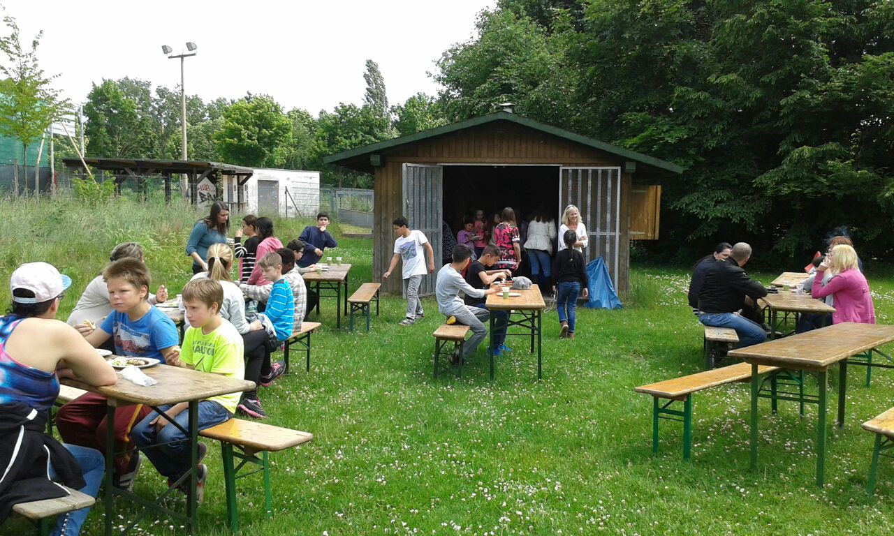 Am Mittwoch, den 03.06.2015 machten sich die Schüler/Innen der 5a/5b und deren Klassenlehrerinnen auf den Weg entlang der Erft zu unserer „Grillparty“ nach Bergheim/Kenten. Nach anstrengendem Lernen J am Vormittag hatten denn auch alle guten Hunger auf Würstchen, Salate und mehr! Fleißig halfen alle beim Aufbau mit und so konnten die Eltern und Geschwister um 14h herzlich begrüßt werden. Diese brachten leckere Speisen aus unterschiedlichen Ländern mit und bald schon stand ein reichhaltiges Buffet zur Verfügung; dazu strahlte die Sonne vom blauen Himmel und sofort kam gute Laune und Ferienfeeling auf! Ausgelassen tobten und spielten die Kinder auf dem angrenzendem Sportplatz oder der
