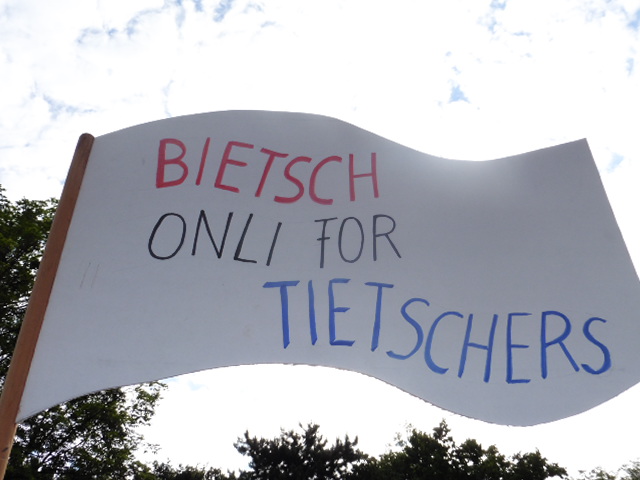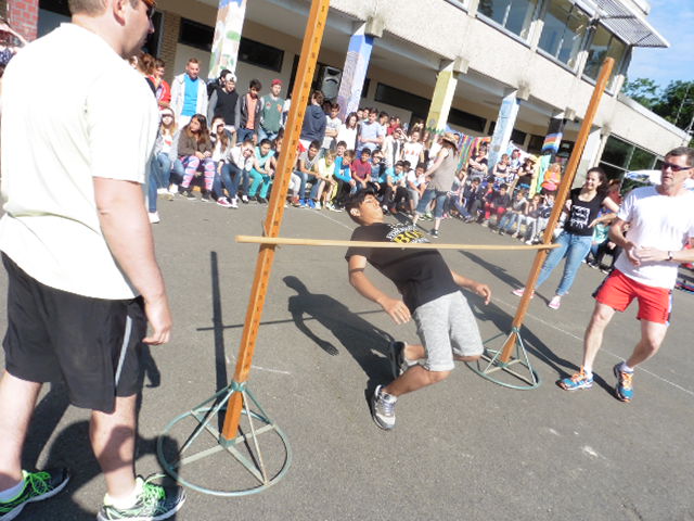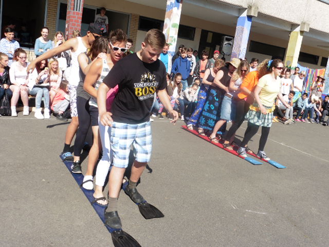chancenlos. Simran, Philis und Marco waren einfach nicht zu schlagen. Beim Tauziehen sah dies allerdings aber schon anders aus und die Lehrer um unsere Kraftpakete Herr Kramskyy und Herr Zensen bezwangen die Schüler deutlich. Es blieb sportlich. Denn es wurde zu Beach-Party-Musik Limbo getanzt; Milena und Shiar legten die Latte allerdings dermaßen tief, da konnten die Lehrer dann doch nicht mehr mithalten. Allerdings hatte die Lehrerschaft beim Sommerski wieder die Nase vorne; unser Fünf-Frauen-Bob gewann das spannende Rennen knapp vor den Schülern. So eng ging es in den letzten beiden Spielen dann nicht mehr zu: Die Schüler gewannen ganz locker das Wasserbomben-Dosenwerfen und die Lehrer hingegen wieder die Doppel im Badminton. Somit ging der Gesamtsieg an die Lehrer. Die Schüler nahmen die Niederlage sportlich und feierten auf ihre Weise: Sie bespritzten sich untereinander