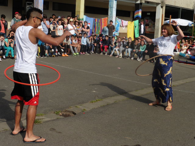 Heute veranstalteten unsere Entlassschüler ihren Abschlussgag. Das Motto lautete Beach-Party und entsprechend passend zeigte sich auch die Sonne von ihrer besten Seite. Die Lehrer waren aufgefordert in verschiedenen Wettbewerben gegen die Entlassschüler anzutreten. So versammelte sich die gesamte Schule auf dem Schulhof; die Zuschauer nahmen die vorgesehenen Plätze ein; während die Lehrer und Schüler ihre „Inseln“ bezogen. Bei der Gestaltung der Inseln waren beide Seiten sehr kreativ. So gab es auf jeder Insel entsprechend Sand, Planschbecken, Liegestühle… Beim ersten Wettbewerb mussten die Lehrer im Hula-Hoop gegen die Schüler antreten und unterlagen