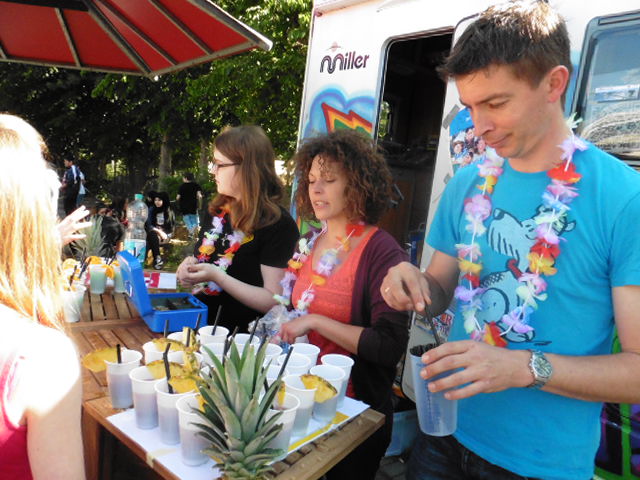 Dazu warb sie im Kollegium für die Beach-Party, sodass eigentlich alle Kollegen im Beach-Outfit erschienen sind und viele hatten dazu noch Strand-Utensilien für die „Lehrer-Insel“ mitgebacht.