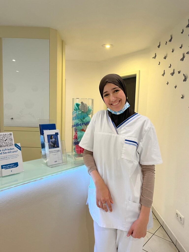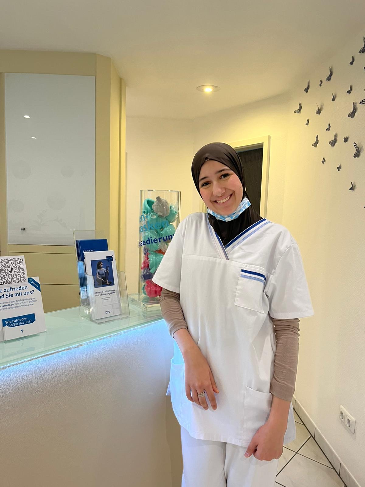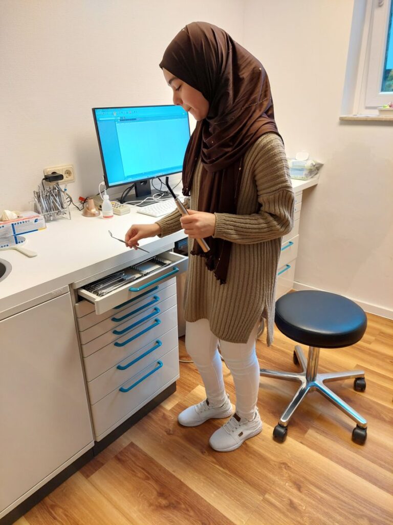 Sicher und routiniert geht Manar mit den medizinischen Instrumenten in der kieferorthopädischen Praxis Dr. Mertens um. Sie kümmert sich um deren Reinigung und Desinfizierung sowie darum, dass sie an ihrem gewohnten Platz dem medizinischen Personal wieder zur Verfügung stehen. Manar ist bereits ein geschätzter Teil des Praxisteams und hat die Möglichkeit, sich hier in ihrem Traumberuf zu bewerben.