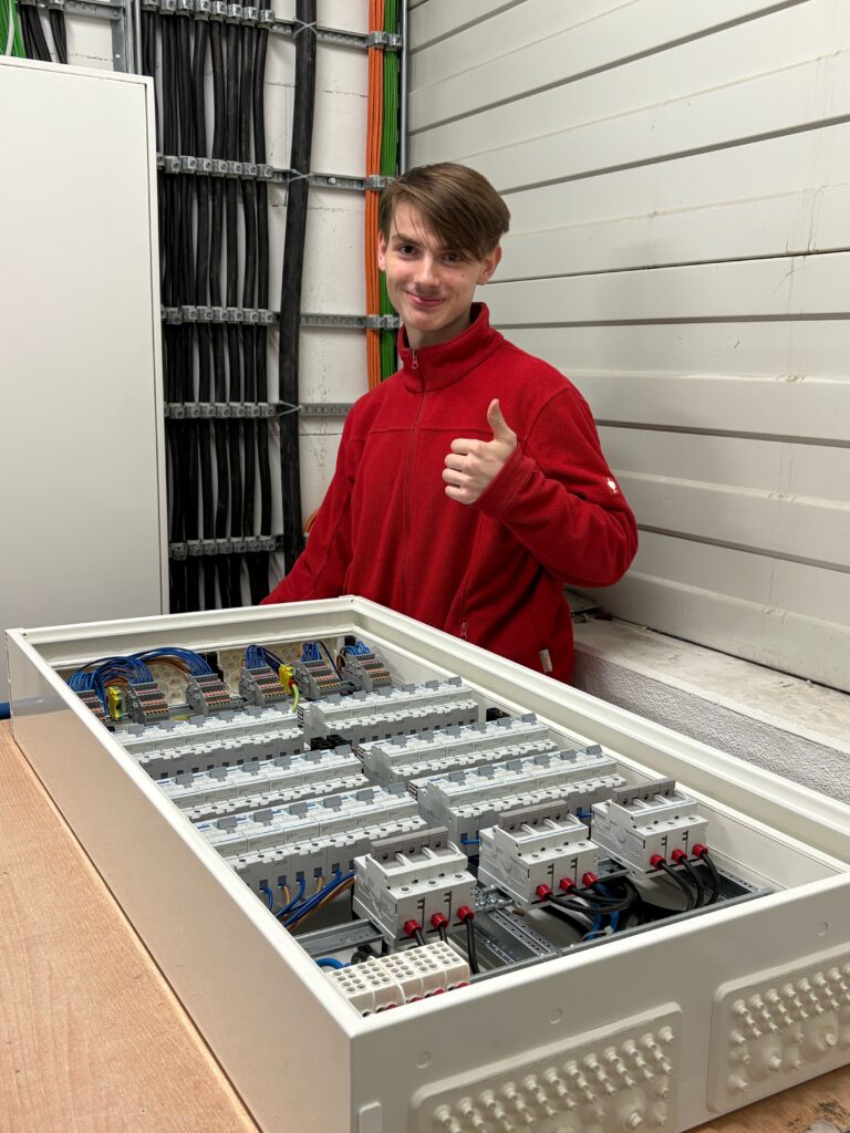 „Die Tage sind lang, aber das macht mir nichts aus, weil die Arbeit Spaß macht“, sagt Etienne. Stolz und zufrieden erzählt er von seinem Praktikum bei Elektro Frenz. Etienne konnte überall reinschnuppern und durfte sehr viele Aufgaben eigenständig übernehmen. Schlitze stemmen, Kabel ziehen, Kabelkanäle anlegen, Sicherungskästen verkabeln etc. – alles kein Problem für Etienne!