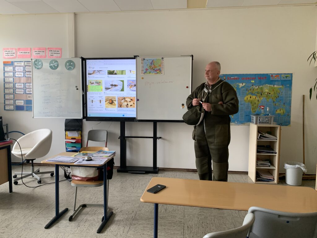 Im Anschluss nahm er sich zusätzlich Zeit für einen spontanen 30-minütigen Vortrag in der Klasse 7b. Dort erklärte er, wie man die Asiatische Hornisse erkennt, warum sie eine besondere Herausforderung für heimische Ökosysteme darstellt und wie Fachleute bei der Entfernung solcher Nester vorgehen.