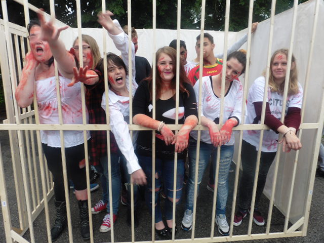 dem Motto „Zombies“. Als sie gegen 9:00 Uhr alle Schüler und Lehrer auf den oberen Schulhof riefen, wirkten sie jedoch gar nicht mehr so untot. Denn sie haben eine ganze Reihe von tollen Spielen vorbereitet, die von den Schülern der verschiedenen Stufen und den Lehrern ausgefochten werden mussten. So wurde mit Medizinbällen gekegelt, Stopp getanzt, nach Jerusalem gereist und und und. Alle hatten an diesem Vormittag eine Menge Spaß und die furchterregenden Zombie-Schüler der Stufe 10 entpuppten sich als gar nicht so gefährlich; im Gegenteil sie glänzten durch eine tolle Organisation, welche auch das Aufräumen und das Reinemachen beinhaltete.