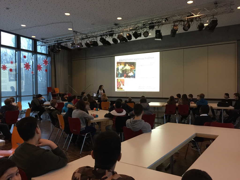 Am Mittwoch, 17.01.2018 stand für die siebten Klassen der Alkoholpräventionstag an. Einen gemeinsamen Einstieg gab es für alle Schüler und Schülerinnen in der Mensa, damit einerseits alle einen Überblick über den geplanten Tag hatten und andererseits wussten, warum Alkoholprävention so ein wichtiges und aktuelles Thema ist. Hiernach durchliefen die Klassen gemeinsam mit ihrer Klassenleitung die einzelnen Stationen. Bei der ersten Station durfte jede/r Schüler/in einmal in den großen „Sack der Süchte“ greifen und etwas herausholen. Im Sack waren Gegenstände zu finden, die bei einigen Menschen Süchte auslösen. Beispielsweise waren hier Bier-/Wein-/Schnapsflaschen, Pralinen, Tabletten, ein Putzschwamm oder eine Barbie-Puppe zu finden. Die