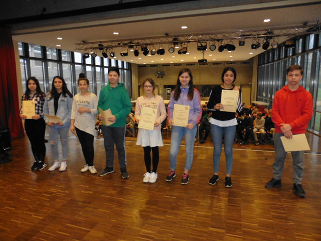 Für tolle Leistungen ausgezeichnet wurden heute wieder die Schülerinnen und Schüler der Erich Kästner-Schule in der Mensa. Denn dort gab es wieder Urkunden für die Schüler mit dem besten Zeugnis und dem besten Lernfortschritt einer Klasse. Für die Klasse 7b erhielt Esra die Urkunde für den besten Lernfortschritt der Klasse; sie sagt: „Ich war sehr nervös, als ich aufgerufen worden bin; ich habe mich aber auch sehr gefreut!“; das beste Zeugnis der Klasse 7b erhielt Nicole zum ersten Mal: „Ich war sehr überrascht, dass ich das beste Zeugnis der Klasse erreicht habe. Ich glaube meine Eltern werden sich sehr freuen. Vielleicht bekomme ich ja ein neues Bett:)“; Michelle Langbein bekam zum zweiten Mal die Urkunde für das beste Zeugnis der Klasse 7c; sie sagt: „Ich habe die Urkunde bereits zum zweiten Mal bekommen. Ich finde das cool und will im Sommer wieder das beste Zeugnis erreichen.“ So wie unseren Schülerinnen aus der Stufe 7 ergeht es wohl allen stolzen Urkundengewinnern. Die nächste Chance für eine Urkunde fängt schon Montag mit Beginn des zweiten Halbjahres an. Ich wünsche allen einen großen Lernerfolg und vielleicht klappt es ja mit einer Urkunde bei der Belobigung zum Schuljahresende.