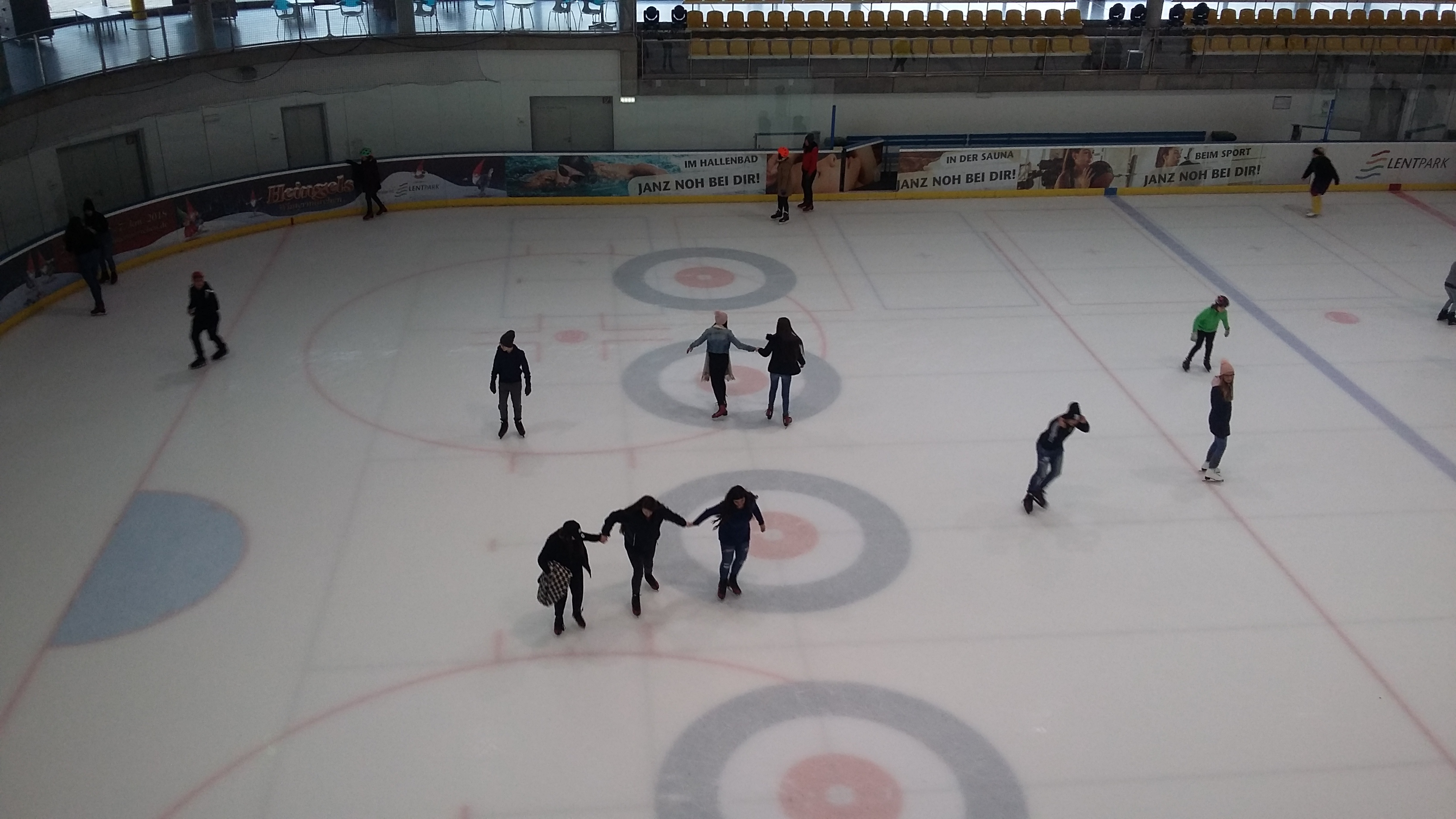 Am 6.2.2018 ging es für die SchülerInnen der Klasse 9c, 10 A1,2,3 in Begleitung von Herrn Kramskyy, Frau Avellino, Frau Büttgen, Frau Swedaj und Frau Zimmermann via Zug und U-Bahn aufs glatte Eis im Lentpark, Köln. Während einige Profis direkt schon ihre Kreise zogen und Kunststückchen zeigten, hatten andere noch ziemliche Startschwierigkeiten. Warum nur ist das Eis so glatt und sind die Kufen so überaus schmal und schnell?