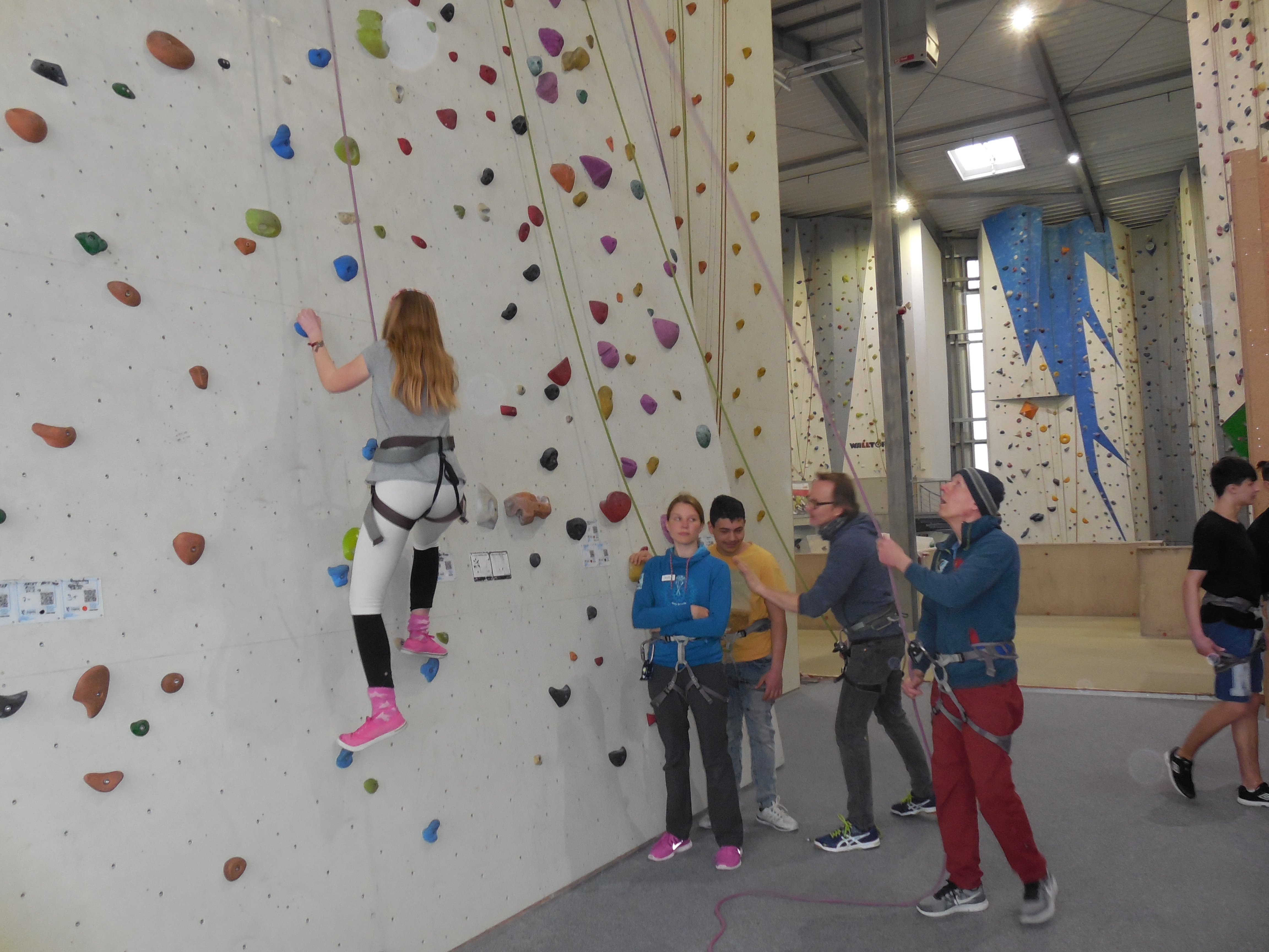 Nach einer guten langjährigen Erfahrung haben wir auch dieses Jahr ein gemeinsames Kletterprojekt mit der Schule zum Römerturm durchgeführt. Die begeisterten Kletterer waren zehn Schüler und Schülerinnen aus der Klasse 9c der EKS Bergheim, genauso viel aus der Oberstufe der Schule zum Römerturm und vier Projektleiter Kurt Welpmann, Janina Goldberg, Slava Kramskyy und Tatjana Schwedaj. In fünf Wochen haben sich die Teilnehmer nicht nur gegenseitig besser kennengelernt sondern auch wichtige Grundlagen vom Klettern erfahren: wie legt man richtig den Klettergurt an, wie man Achterknoten macht und was der Partnercheck bedeutet.