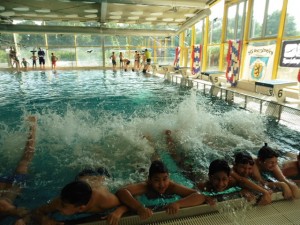 Fast eine halbe Hundertschaft ging bei unserem Schwimmfest zum Schuljahresende an den Start: 49 Schülerinnen und Schüler der Jahrgangsstufe fünf waren mit von der Partie, als es darauf ankam, die geschicktesten Springer, die flottesten Schwimmer sowie die besten Taucher auszumachen. Bei der Klassenwertung hatte am Ende die 5b von Frau Steinbach knapp die Nase vorn …
