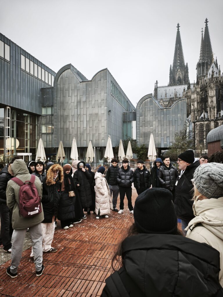 Der Nationalsozialismus unter Adolf Hitler ist die dunkelste Zeit in der deutschen Geschichte. Aber wie war das konkret vor Ort? Wie war diese Zeit in Köln? Unterstützt durch die sachkundige Führung von Markus Zens von ECHT KÖLN! begaben sich die Schüler und Schülerinnen der 10A2 und 10B auf die Spuren dieser Zeit in Köln. Immer wieder schaffte es Markus Zens, die Geschichte an verschiedenen Orten in Köln durch wahre Begebenheiten und Schicksale für uns lebendig zu machen. So erfuhren wir von mutigen Bürgern, wie z.B. dem Radfahrer Albert Richter, die sich dem Nazi-Regime nicht beugten und dies mit dem Leben bezahlte. Orte aus unserem alltäglichen Leben wie z.B. der Deutzer Bahnhof war zur NS Zeit der Bahnhof, von dem aus viele Menschen jüdischen Glaubens in die Konzentrationslager deportiert wurden. Anschaulich zeigte Markus Zens auch Parallelen zum aktuellen politischen Geschehen z.B. in den USA auf, wo brutal gegen Menschen vorgegangen wird. Die Führung hat uns eine Menge Dinge zum Nachdenken mit auf den Weg gegeben – zur Geschichte, aber auch zu deren Bedeutung in unserer heutigen Zeit.